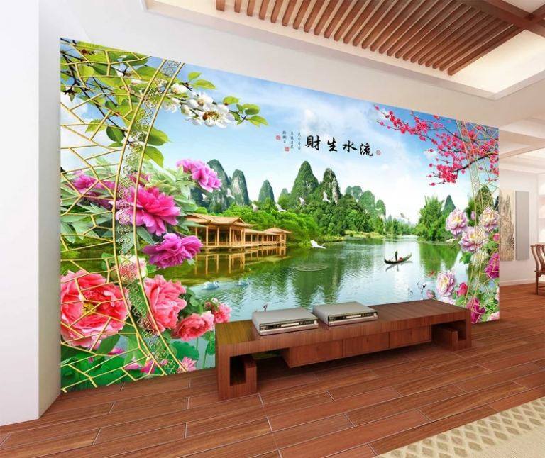 Điểm nổi bật nhất trong bức tranh đó là sự sắp xếp hợp lý của quy luật phong thủy. Phong thủy có ảnh hưởng không nhỏ đến sựu phát tài của gia chủ. Bức tranh giấy dán tường phong thủy 3d phía trên kết hợp giữa màu xanh của cây cỏ cùng với sự gợn nhẹ của sông nước với ý nghĩa mang đến cho gia chủ nhiều tài lộc mới.